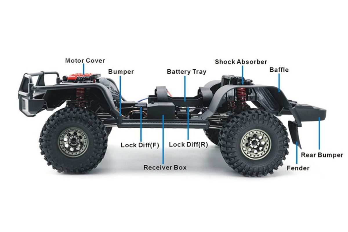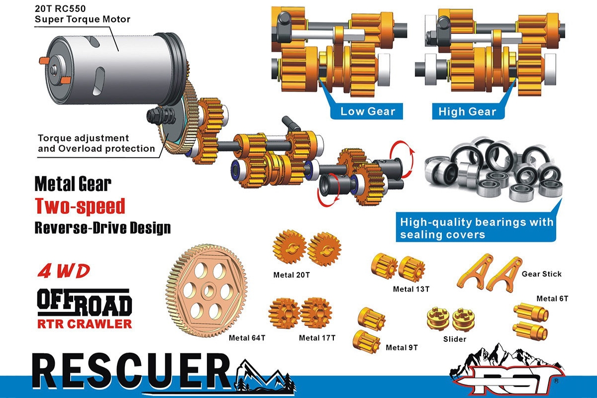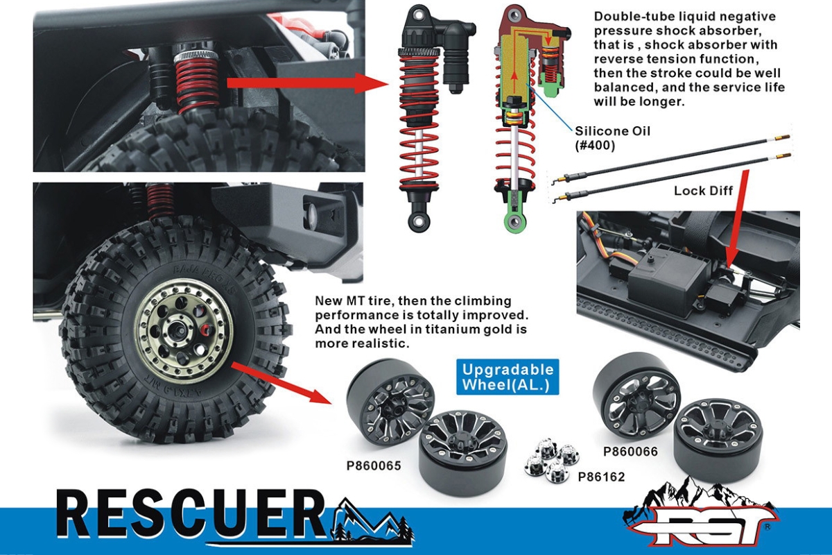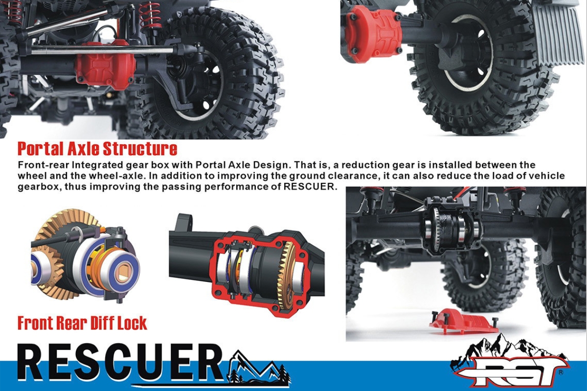 Rescuer verfügt über einen festen Fahrwerkrahmen, einen Radstand von 324 mm, ein 2-Gang-Getriebe mit Rückwärtsgang, einen maximalen Abbiegewinkel von 42 Grad, Portalachsen mit sperrbaren Differentialen, Metallgetriebe, einstellbare Piggy Back Dämpfer aus Metall mit Doppelfedern, abgedichtete hochwertige Lager und CVD-Halbwellen aus Metall.