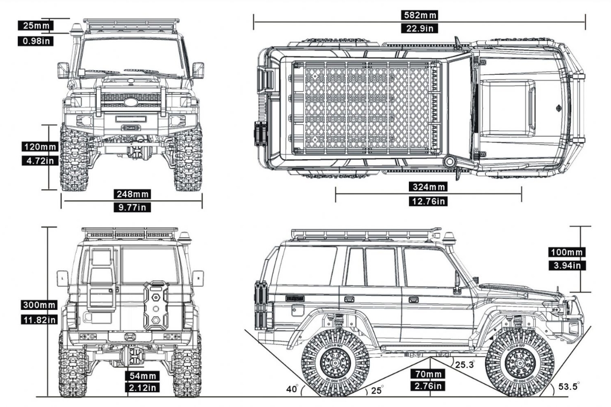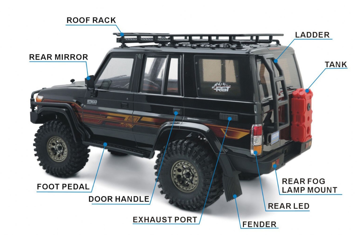 Die Karosserie aus 1,5 mm starkem Lexan hat durchsichtige Fenster, eine zu öffnende Motorhaube, unter der sich die V8-Motorabdeckung befindet. Weiter verfügt die Karosserie über ein spezielles LED-Lichtmodul und eine Reihe von Zubehörteilen wie Dachträger, zusätzliche Lichter, Schnorchel, Rückspiegel, Türklinken, Leiter, Tank und vieles mehr.