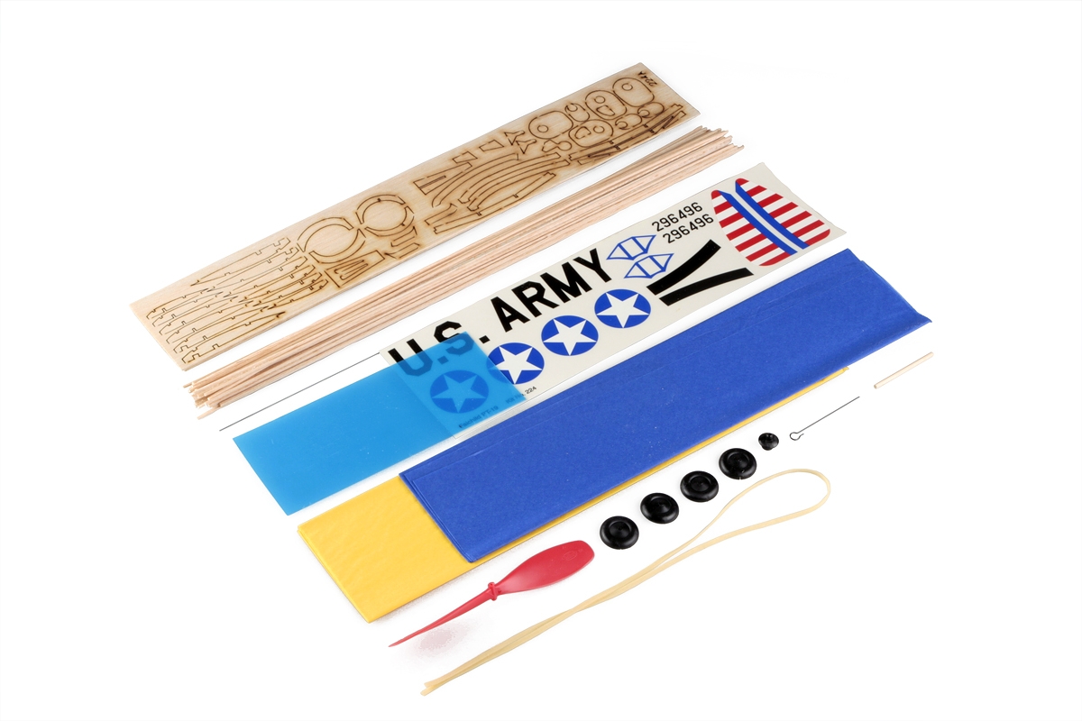 Rubber-powered mini model of the American low-wing trainer. Laser cut parts, propellers, rubber harness and cover. material. Span 445mm.