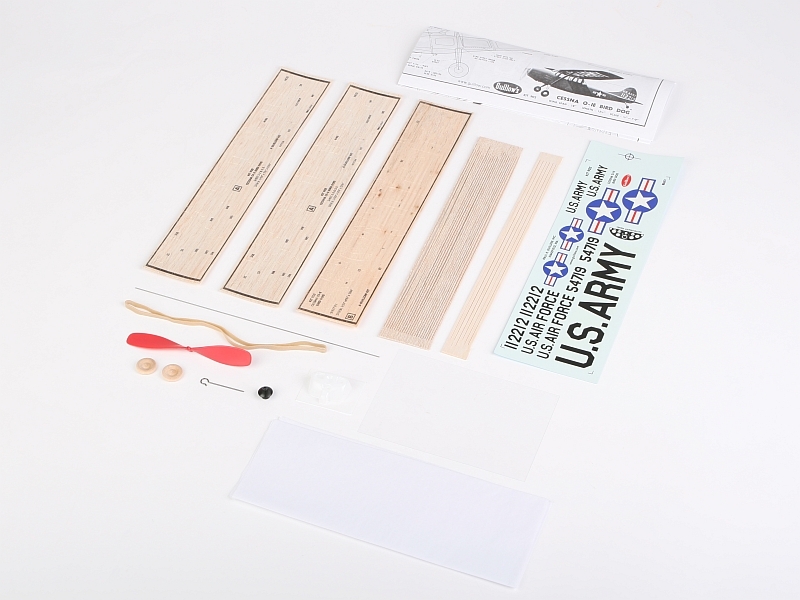 Mini-scale of US communication and reconnaissance aircraft from the 50s and 60s with rubber band drive. Die-cut parts, propeller, rubber band bundle and cover. Wingspan 457 mm.