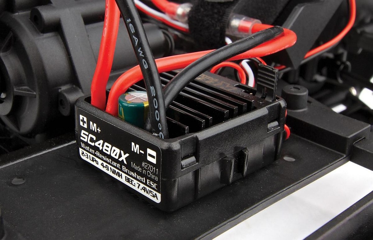 Reedy power electronic speed controller (ESC): The water-resistant SC480X brushed ESC is specifically programmed for crawling with proportional forward/reverse, dual auxiliary power output leads, LiPo low-voltage cutoff protections, and T-plug connector.