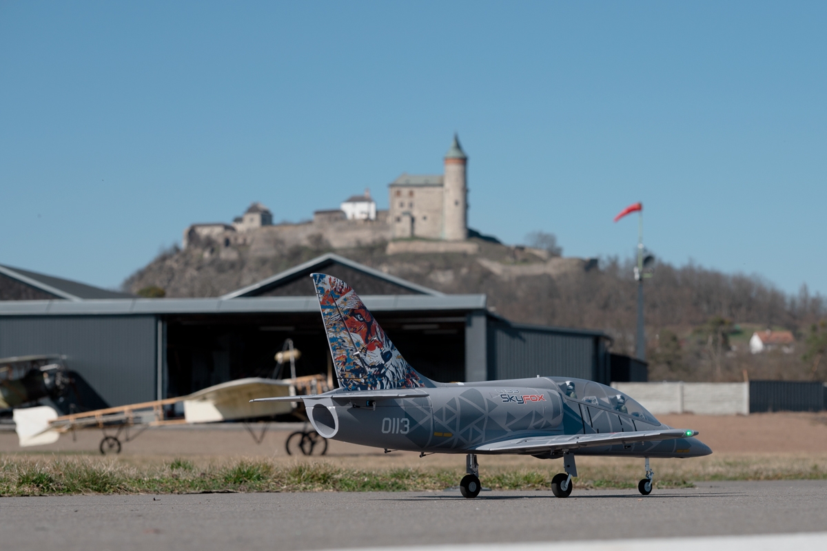 You will need at least a 6-channel RC set to control your Skyfox; even a non-computer radio would work as the aileron, flap, rudder and steerable front undercarriage servos are controlled by a single channel each (linked via the pre-installed connection board). The board feeds the LED lights as well; the connected sequencer controls the retracts. The instruction manual contains a thoroughly tested set-up table in order to help you set up the L-39 easily.