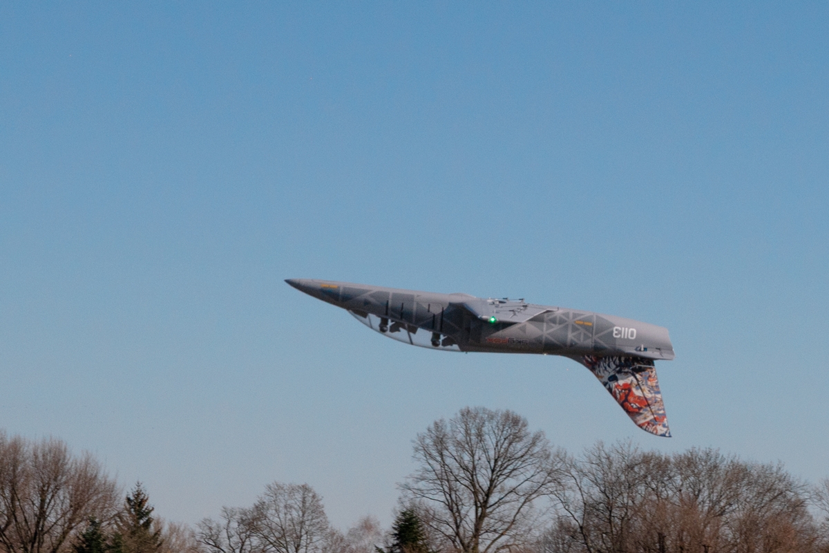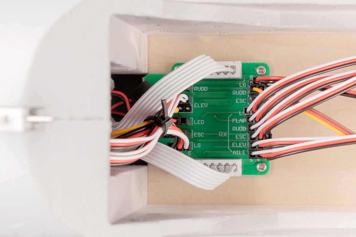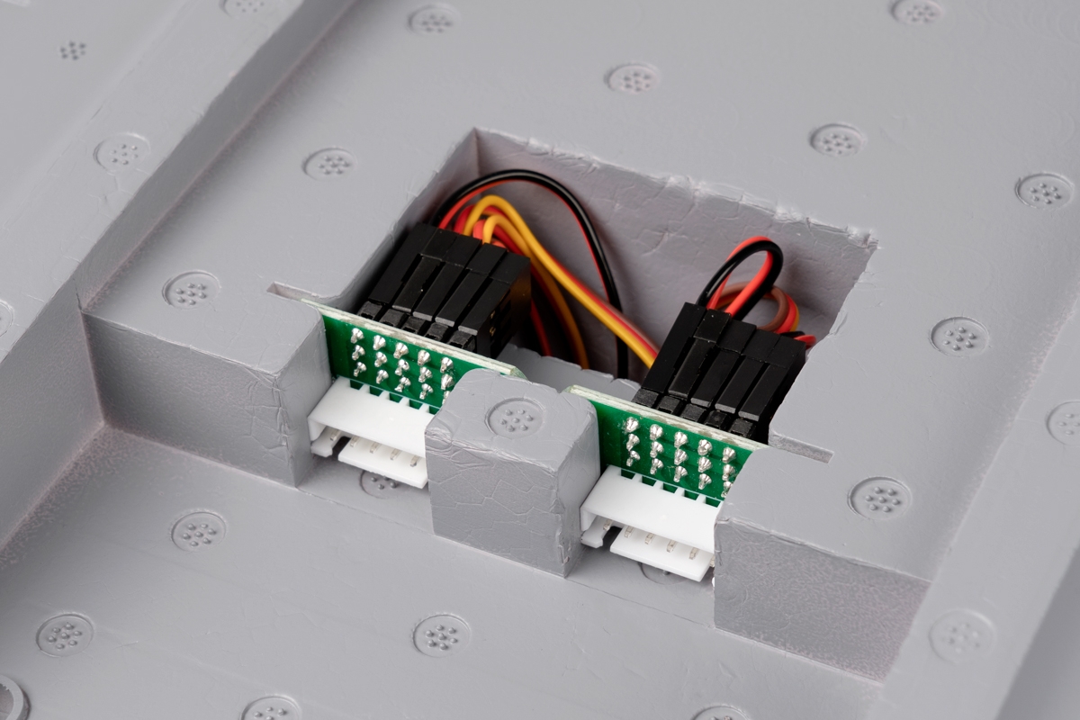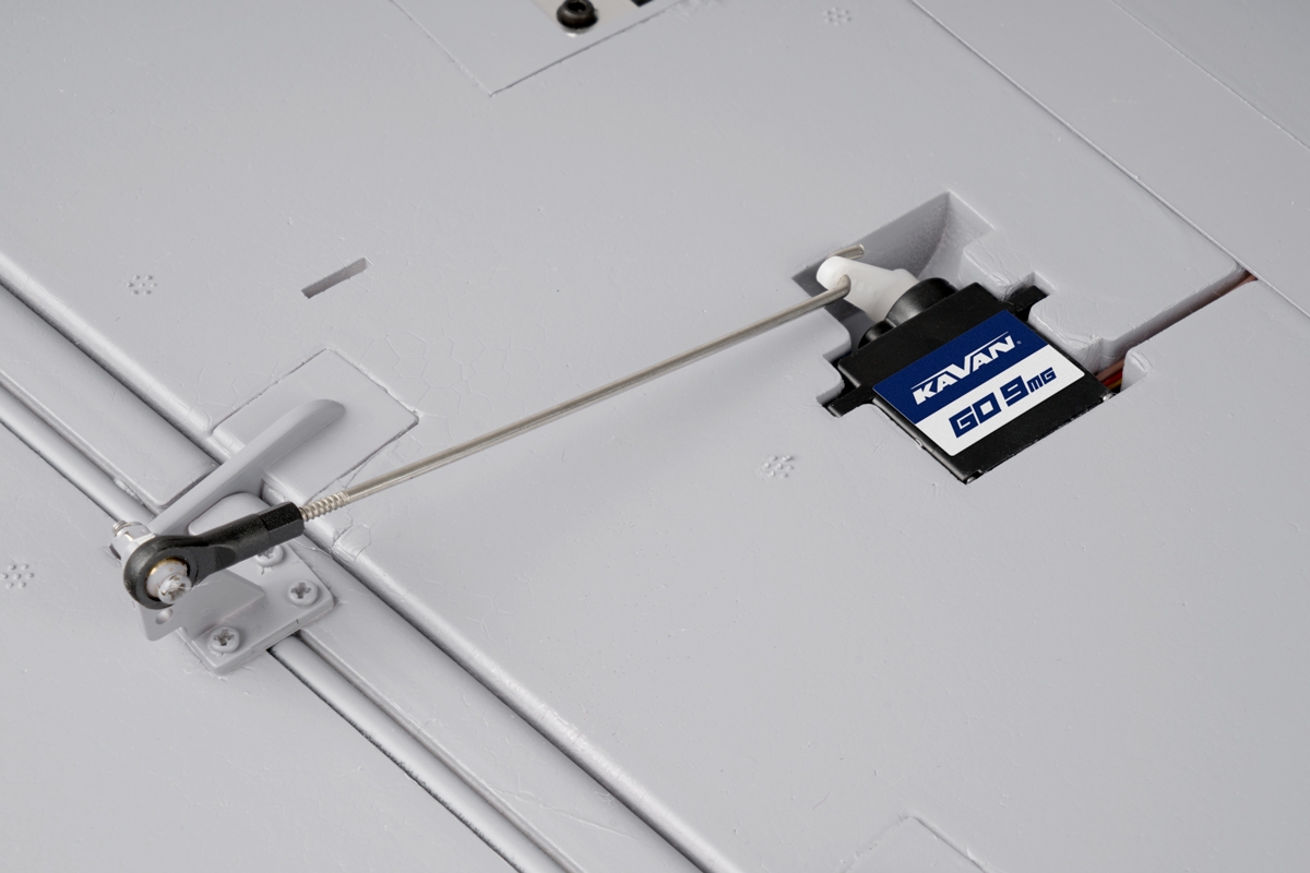 The one-piece EPO wing is reinforced by carbon spars and joined together with a carbon tube joiner. The wing is secured by bolts to the fuselage. The ailerons and flaps are controlled by two pairs of servos installed in the wing driven with short wire push rods; there are position and landing LED lights installed as well.