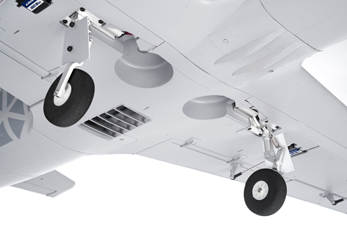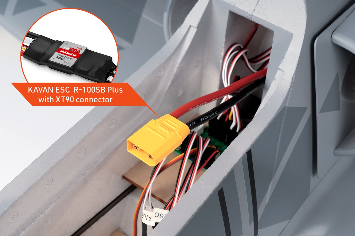 The EPO foam fuselage, thoroughly carbon-reinforced, comes with the 80mm EDF fan with C3552-2000 brushless motor, and KAVAN R-100SB Plus ESC featuring a powerful switching SBEC stabilizer necessary to feed all 8 servos aboard. The removable upper tail part of the fuselage secured with screws offers easy access to the fan and motor. The detachable canopy is secured with a pin at the front and one latch in the rear. The cockpit compartment offers a lot of space for your receiver and flight pack