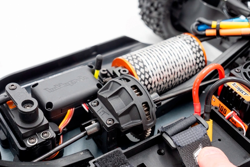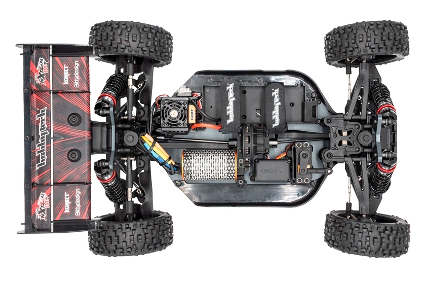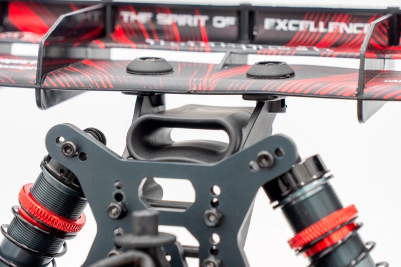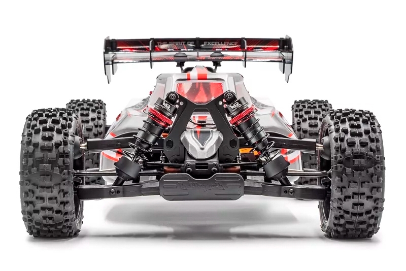 The NXT RR RTR is the latest evolution of our iconic 1/8 brushless RTR buggy. Many improvements have been made to make it more efficient and reliable. New parts have been designed to modify the layout on the chassis to improve the center of gravity. The entire transmission has been reinforced by the use of treated "spring steel" type universal joints. Its exterior appearance has also been evolved with the use of a TZO brand spoiler mounted on a new "monobloc" type support, and with a new body shape whose design is the most used in competition today.