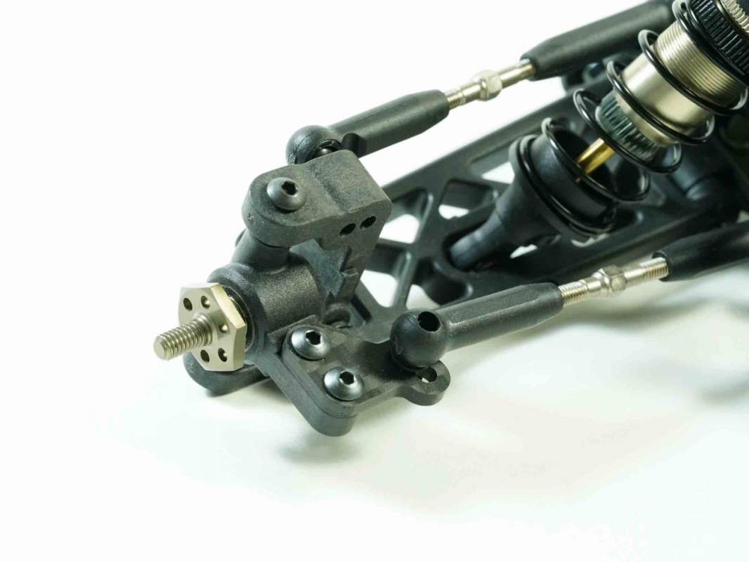 The rear shock tower of the S12-2D is made of High Quality Carbon. With the wing mount holder, height and angle of the wing can be adjusted. The rear width of the S12-2D can be changed through rear hubs and rear CVD modularity.