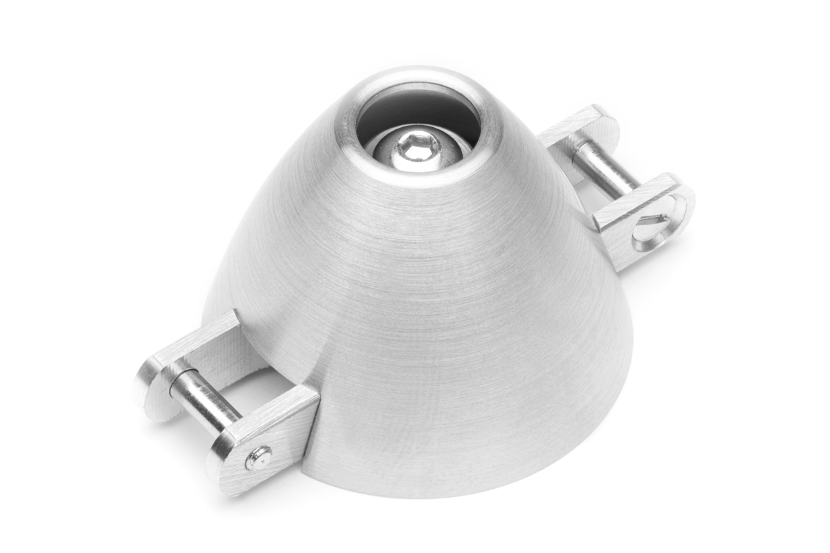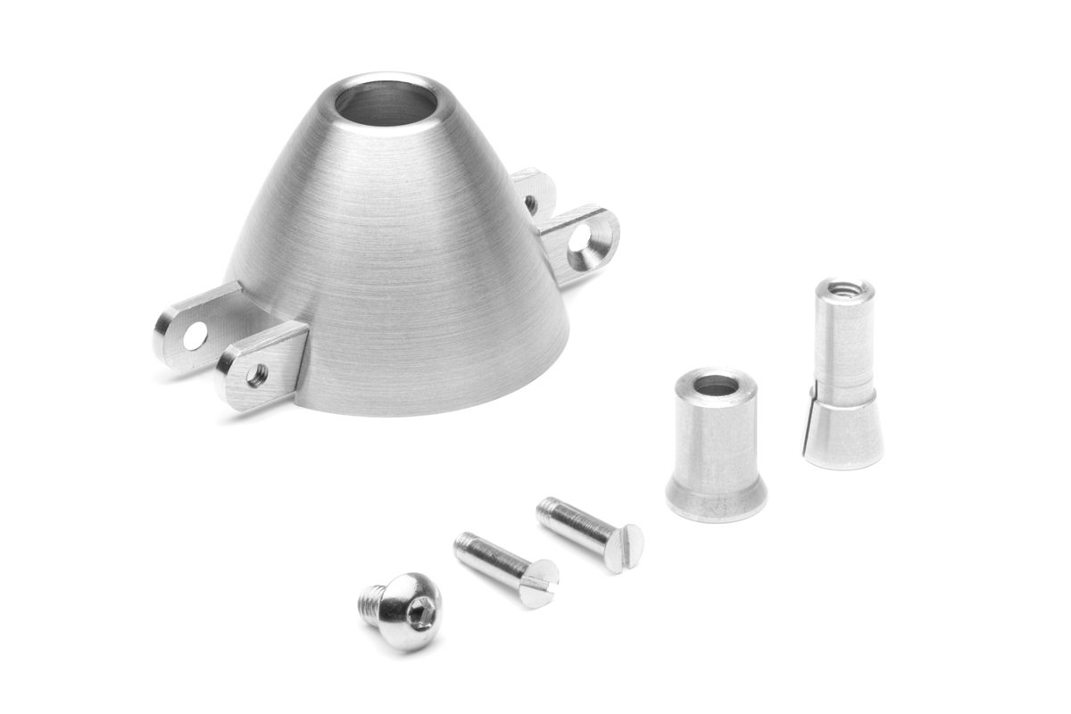 Precision alloy TURBO cone for folding propeller with a diameter of 36 mm with a collet of 3.2 mm, with 3 mm pins for propeller blades with a root thickness of 8 mm. Made in Czech Republic.