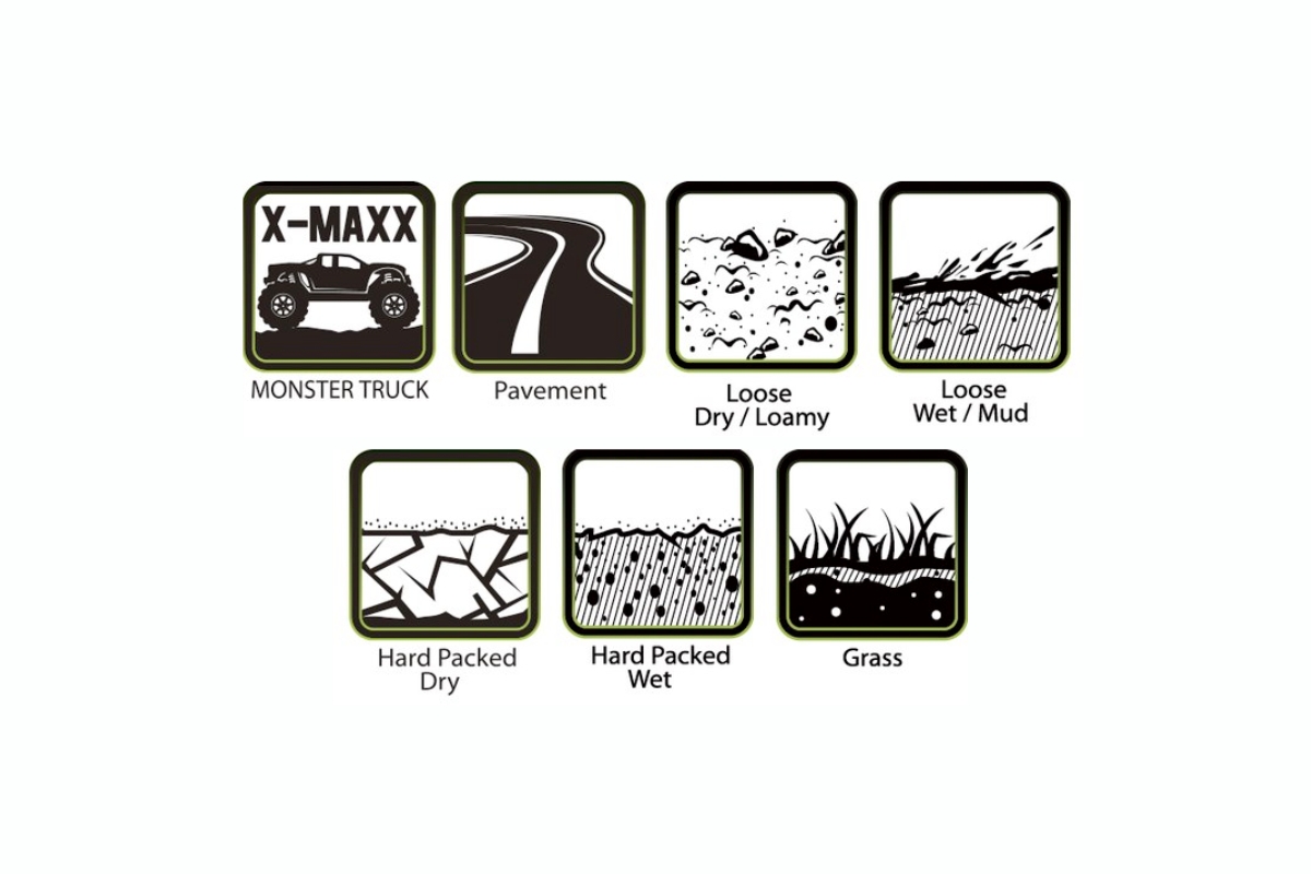 Complete wheels for 1/5 scale monster truck. Tires suitable for both wet and dry, all surfaces. Rims for Traxxas X-Maxx.